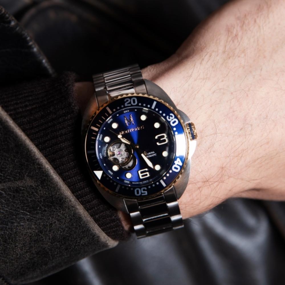 - ساعة Montignac MOW909 الرجالية بتصميم هيكلي فخم، علبة مربعة باللون الأسود ولمسات ذهبية أنيقة، تعمل بحركة أوتوماتيكية دقيقة، وتأتي بسوار جلدي فاخر يضفي لمسة من الفخامة العصرية.