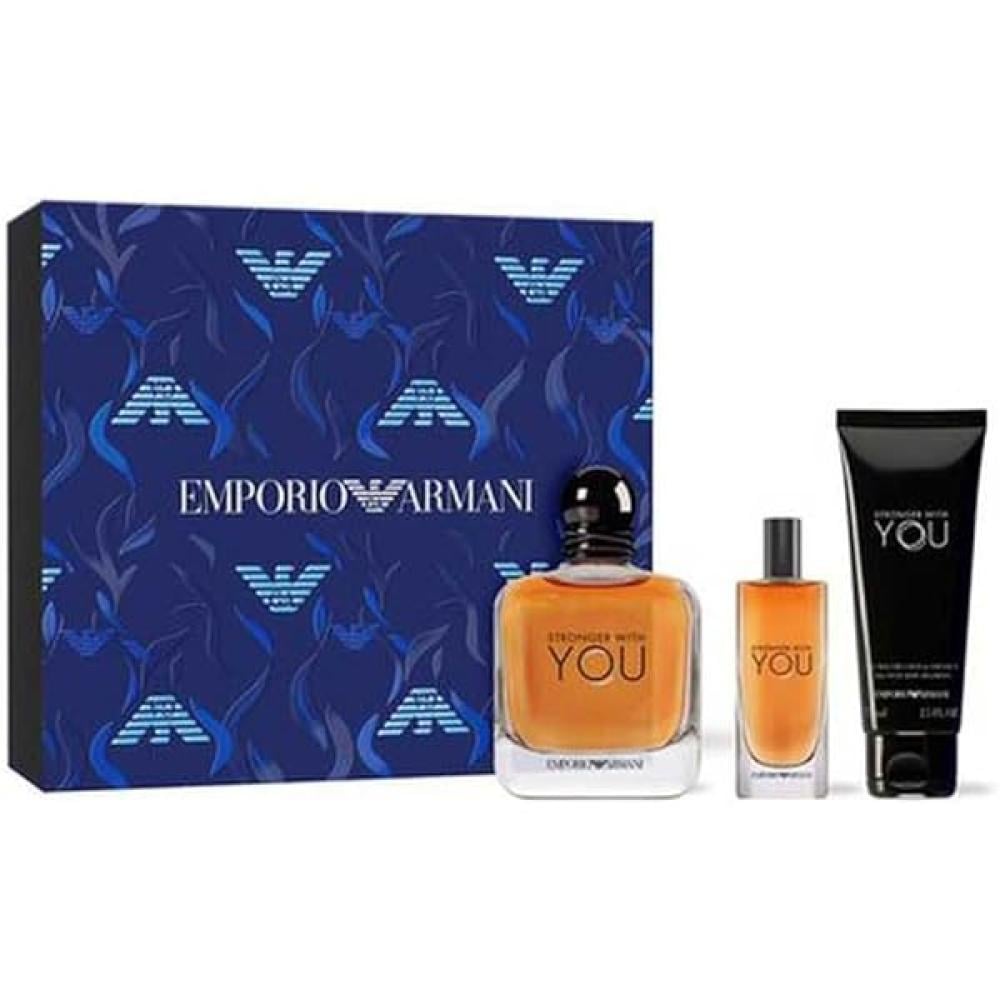 هذه مجموعة عطرية فاخرة للرجال من Emporio Armani تتكون من ثلاثة قطع: عطر سترونجر ويذ يو أو دو تواليت 100 مل، عطر صغير 10 مل، و جل استحمام للجسم 75 مل. يشتهر العطر بمزيج عصري يجمع بين نوتات حارة وخشـبية وحسية.